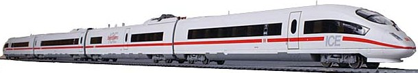 (HO scale 3-rail) Four part high speed train set ICE-3 of the German Deutsche Bundesbahn DB in white livery and red stripes. The set is composed by a first class driving coach, a BordBistro restaurant car, a second class coach with pantograph and a second class driving trailer coach. Model is for the three rail Marklin system and is equipped with digital decoder. Can be lengthened by center coaches 57690 and 57691. Epoch V, full interiors, operating pantograph, digital complete, bi-directional white/red headlights, length: 1116mm.
