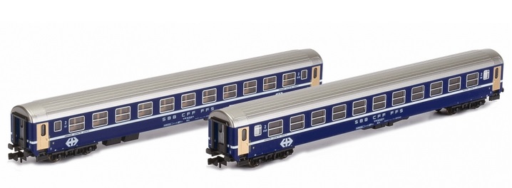 (N scale) 2-tlg Liegewagenset Bcm SBB altes Logo blau IB. From 1964 onwards, the SBB also underwent a fundamental renewal of the rolling stock with an eye to international traffic. ÖBB also had these wagons built by Jenbachwerke under a license agreement in 1976 and used them on the Austrian rail network. SBB experimented with different green variants, which are also reproduced in the model. To match the passenger cars, sleeping cars, couchette cars and restaurant cars were also put into service and used on the cross-border routes to Austria, Italy and Germany. Content: 2x couchette coaches Bcm, 2nd class, version with old SBB logo Model features: - Spring-mounted bogies - ex works with interior lighting