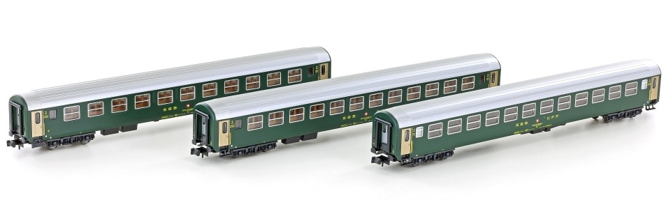 (N scale) 3-tlg Wagenset Bm 2.Kl. altes Logo grün IB. From 1964 onwards, the SBB also underwent a fundamental renewal of the rolling stock with an eye to international traffic. ÖBB also had these wagons built by Jenbachwerke under a license agreement in 1976 and used them on the Austrian rail network. SBB experimented with different green variants, which are also reproduced in the model. To match the passenger cars, sleeping cars, couchette cars and restaurant cars were also put into service and used on the cross-border routes to Austria, Italy and Germany. Content: 1x type Bm compartment car, 2nd class with 11 windows, version with the new SBB logo 2x type Bm compartment car, 2nd class with 12 windows, version with the new SBB logo Model features: - Redesign of the compartment car with 12 windows - Spring-mounted bogies - ex works with interior lighting