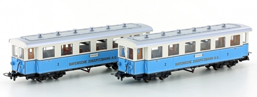 (HOm scale) Zugspitzbahn 2 Wagen HOm. Cars including interior lighting and, depending on the version, front lighting. The Bavarian Zugspitzbahn of the Bavarian Zugspitzbahn Bergbahn AG is beside the Wendelsteinbahn one of the oldest mountain railways in Germany. The route leads directly from Garmisch Partenkirchen to the Zugspitze, the highest mountain in Germany. The route starts with the valley railway between Garmisch Partenkirchen and Grainau, from there the steep descent to the Zugspitze over into a cog railway.