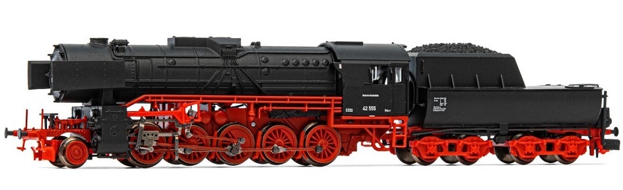 (N scale) DB, steam locomotive class 42 in black/red livery, 42 555, period III, with DCC-sounddecoder. The heavy freight locomotive in N scale is almost completely made of high-quality diecast metal. The engine placed in the boiler is quiet, powerful and has a brass flywheel mass. Gauge N Length 144 DCC Type DCC Sound Fitted Period III Operator/Livery DB Age Suitability 14+ Motor With Flywheel