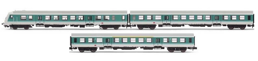(N scale) HN4366 DB AG, 3-unit pack regional coaches (1), 1 x control cab coach, 1 x ABy, 1 x By, period V, mintgreen/white