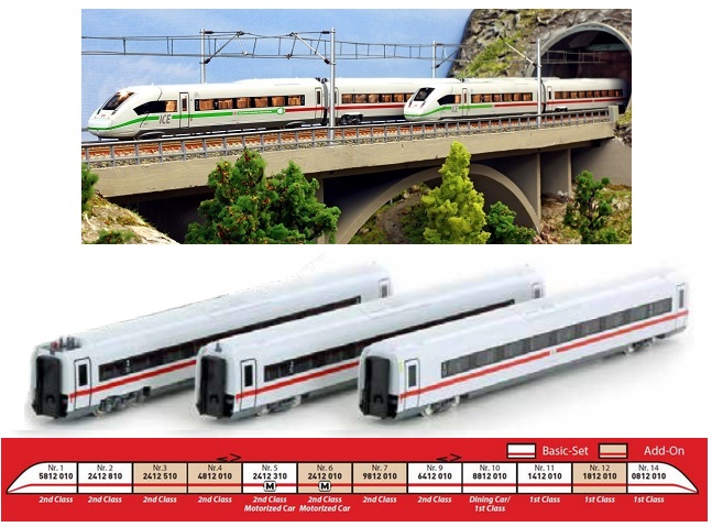(N scale) ICE 4 - BR412 DB AG Klimaschützer 3-part center set. ICE 4 is a brand name for long-distance Intercity-Express high-speed trains being procured for Deutsche Bahn. Procurement started around 2008 for replacements for locomotive-hauled InterCity and EuroCity train services, and was later expanded to include replacements for ICE 1 and ICE 2 high-speed trainsets. In 2011 Siemens Mobility was awarded the contract for the 12 unit car sets. The 12-car sets, K3s, are formed as follows.[34] Car No. 14 12 11 10 9 7 6 5 4 3 2 1 Designation Apmzf 0812.0 Apmz 1812.0 Apmz 1412.0 ARmz 8812.0 Bpmbsz 6412.0 Bpmz 9812.0 Bpmz 2412.0 Bpmz 2412.3 Bpmz 4812.0 Bpmz 2412.5 Bpmz 2412.8 Bpmdzf 5812.0 Class and function 1. Class Cab car 1. Class 1. Class 1. Class Bordrestaurant 2. Class Servicewagen 2. Class 2. Class 2. Class 2. Class 2. Class 2. Class 2. Class Cab car Seating capacity 50 67 67 21 in 1. Class 22 in Restaurant 38 88 88 88 88 88 88 59 +2 folding seats .
