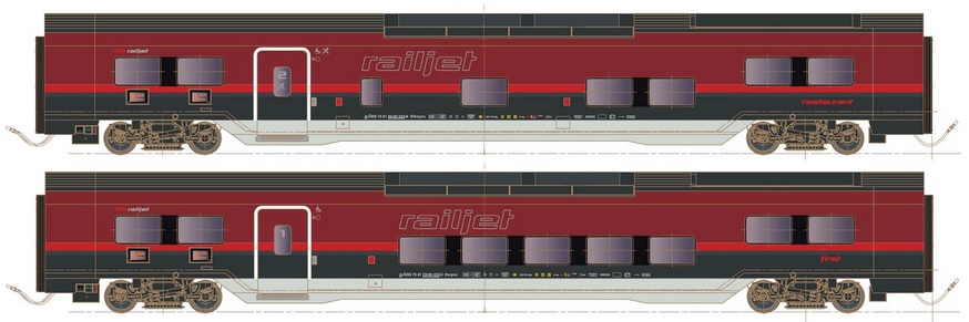 (N scale) H25403 ÖBB Railjet DANI 2-tlg. Speisewagen + 1. Kl. Wagen, Ep.VI