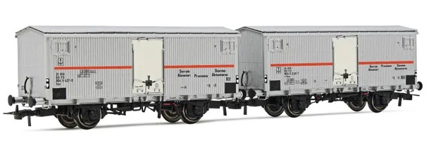 RIVAROSSI HR6604 FS, 2-unit pack refrigerated wagons Ifms 2-axles without brakeman's cab, metallic doors, silver, red stripe, ep. IV