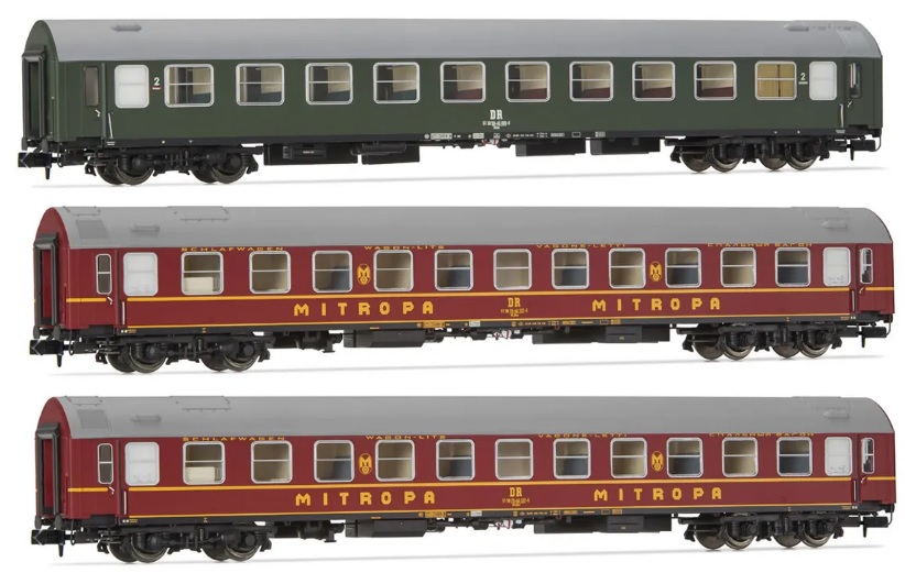 ARNOLD HN4423 DR, 3-unit pack OSShD type B coaches, Spree-Alpen-Express, set 1 of 2, green and red livery, ep. IV, 1 x Bc + 2 x WLAB