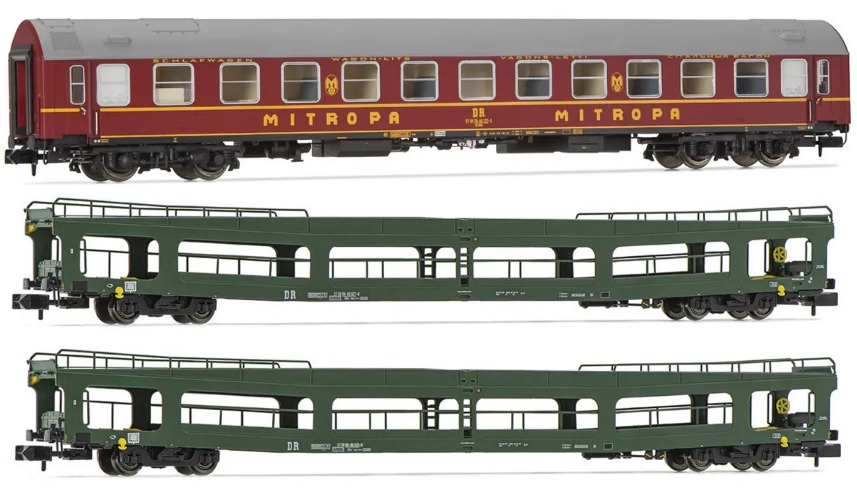 ARNOLD HN4424 DR, 3-unit pack OSShD type B coaches, Spree-Alpen-Express, set 2 of 2, green and red livery, ep. IV, 1 x WR + 2 x DDm