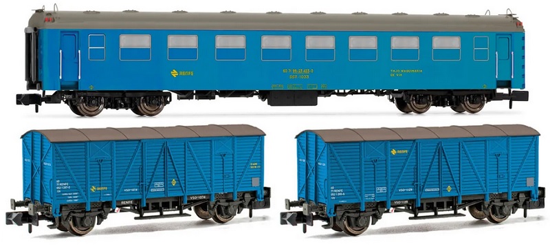 (N scale) HN4457 RENFE, 3-unit set Tajo de Vía, type 5000 coach + 2 x J3 wagons, blue livery, ep. IV-V