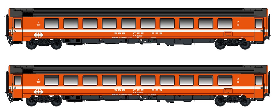 (N scale) 2er Set Personenwagen Bpm, 2.Kl. (UIC Z1) SBB, Ep.IV-V, oran.