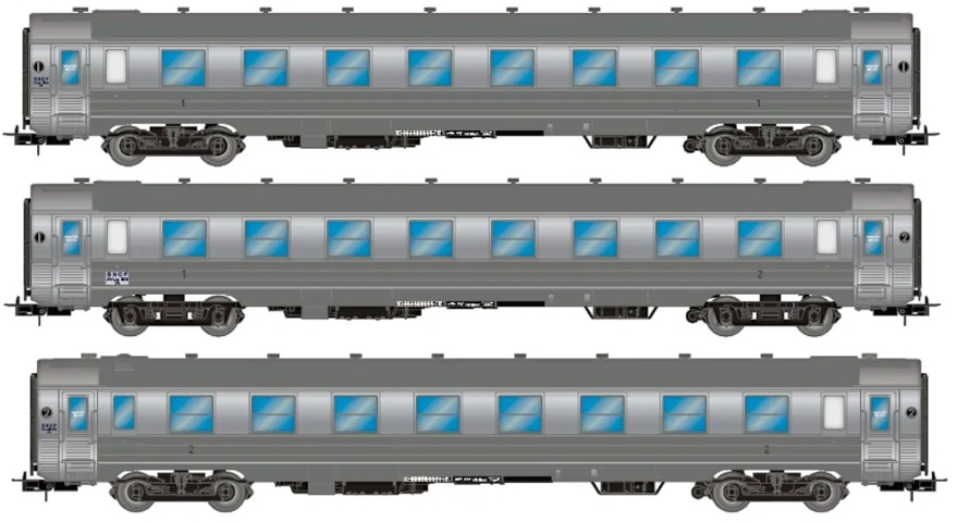 JOUEF HJ4174 SNCF, 3-unit pack short DEV Inox coaches (A8myfi 1st cl., A3B5myfi 1st/2nd cl., B5smyfi bar), ep. IIIa. Expected Q3
