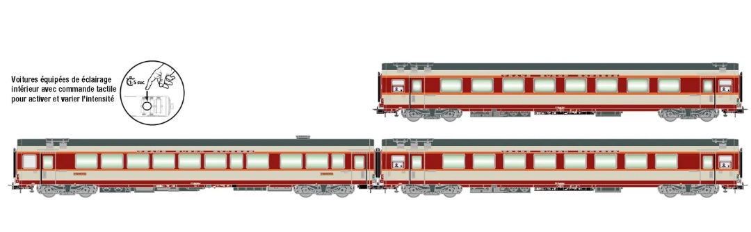(HO scale) HJ4191 SNCF, 3-unit pack Gran Confort coaches TEE Le Kléber (A8u, A8tu, Vru), betón grey, ep. IV. Factory installed interior lighting, exact interior fittings.