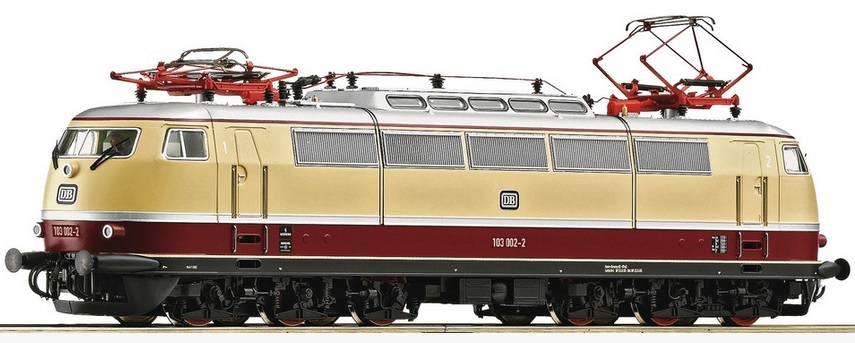 (HO scale) ROCO 7510064 Electric locomotive 103 002-2, DB, Ep. IV, DCC, Fitted with sound?: yes, Digital interface: Plux22, Additional light functions: driver's cab, engine room, Length over buffers: 224, Minimum radius: 358 mm.