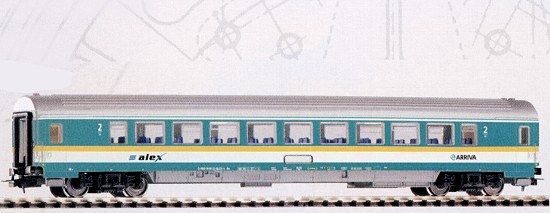 (HO scale) First class open plan coach "Arriva" of the German regional ALEX railway. Epoch V, full interiors, NEM couplers, length: 264mm.
